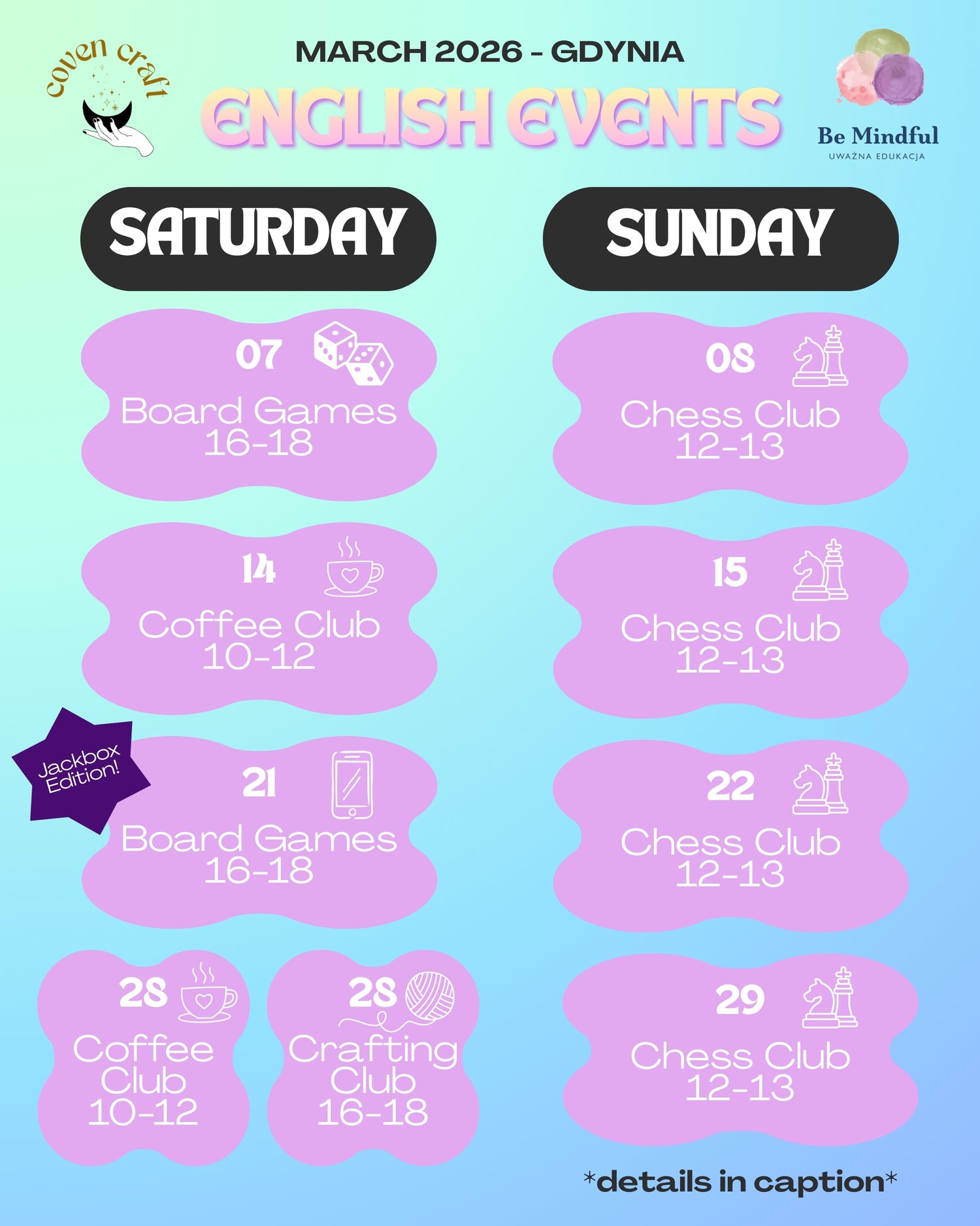 We have an English-speaking event every Saturday and Sunday! All tickets include entry to the event as well as coffee or tea from the cafe. All ages and levels of English are welcome!
