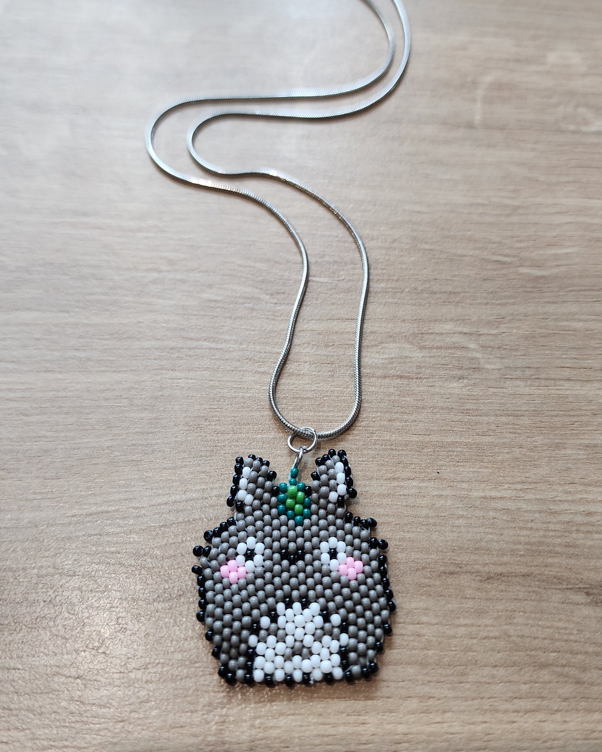 Handmade beaded forest spirit necklace using glass seed beads on a black cord